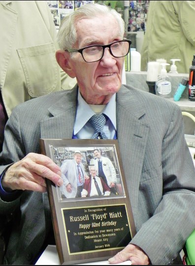 A PLAQUE FOR AMERICA’S BARBER–Russell Hiatt of Floyd’s City Barber Shop poses with a plaque of appreciation presented to him by Downtown Mount Airy, Inc., on January 28, his 92nd birthday. (Oh, and Goober reminds us…there was a cake, too!)